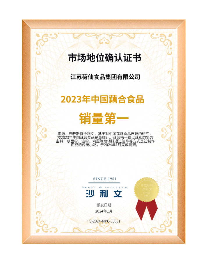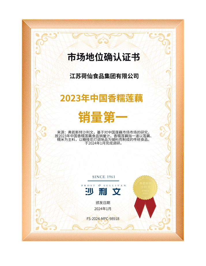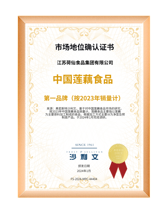 2024年1月,,,,,,江苏HOME-彩霸王「强保障平台,更省心娱乐」食物集团获得全球权威机构Frost& Sullivan弗若斯特沙利文“一连10年全球莲藕食物销量第一”“2023年藕合销量中国第一”“2023年香糯莲藕销量中国第一”“中国莲藕食物第一品牌”多项权威认证。。。。。。
